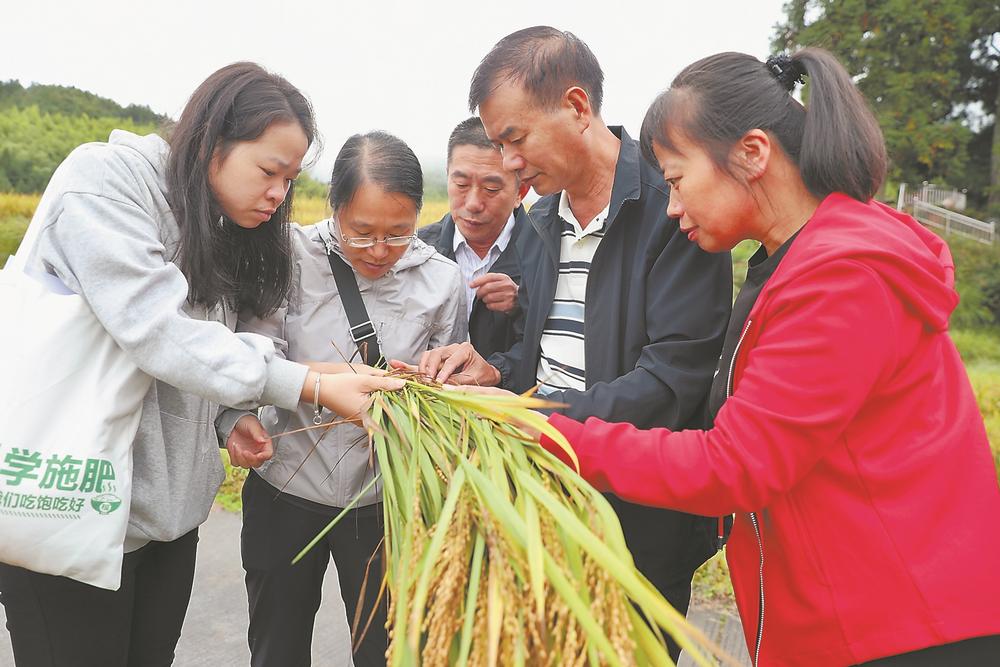 此次测产将试验地划分为高、中、低三种类型进行实割测产,每种类型实收0.5亩以上,每块田采取随机取样,测量株行距、有效穗、穗实粒数等数据,并现场收割水稻,脱粒称重,测量水分,代入公式计算样方产量,折算亩产量。测产结果经加权平均,亩产干谷约350公斤。