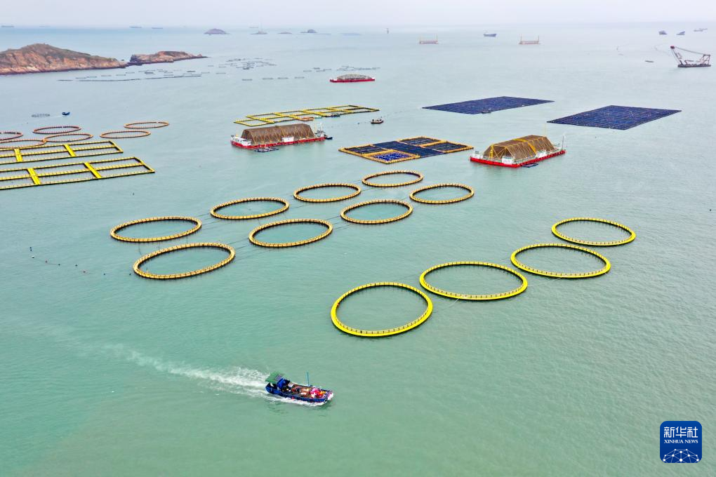 10月10日,福建省连江县定海湾内渔船经过深水网箱、渔排及深远海养殖平台(无人机照片)。新华社记者 姜克红 摄