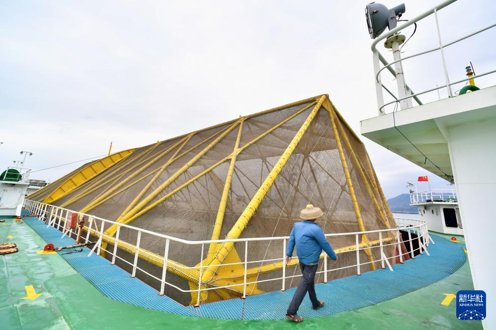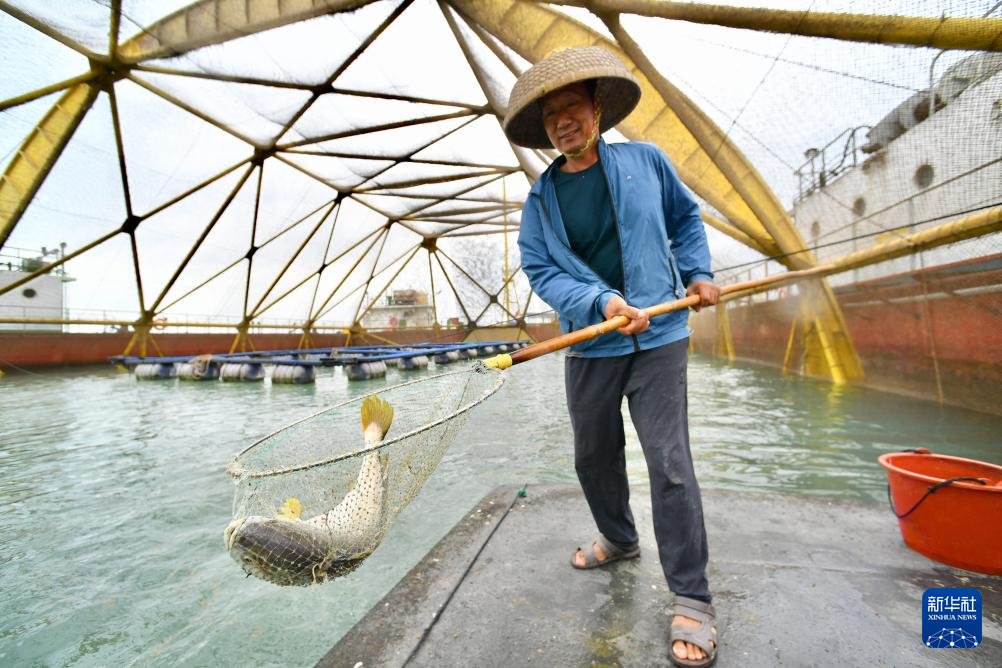 10月10日,在福建省连江县“定海湾1号”深远海养殖平台,工人打捞养殖大黄鱼。新华社记者 姜克红 摄