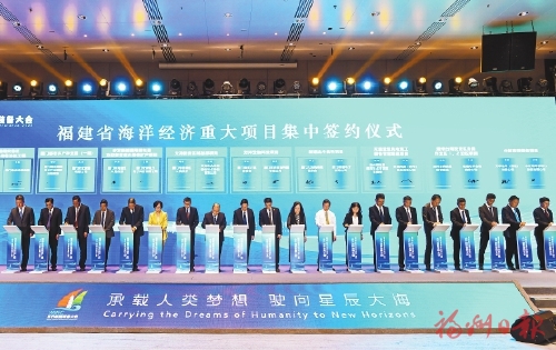 在福建省海洋经济产业合作创新发展大会上,福州现场集中签约万华福建工业园异氰酸酯一体化二期项目、万华化学与ADNOCL&S船舶运输及管理合作项目、大东海高端精品钢铁项目、万华超大型化工原材料运输船船舶建造项目、亚通新材料海洋装备产业园项目、赛思亿电动船舶项目、中核海洋装备项目、思嘉水上气密性材料生产基地、青山航海装备产业园项目、闽侯水下无人装备产业基地及工程研究中心项目、福州海洋科创综合体项目、盛丰高新智慧科技产业园、海欣食品水产品精深加工及速冻菜肴制品项目、罗星海洋生态产业项目等14个重大项目。