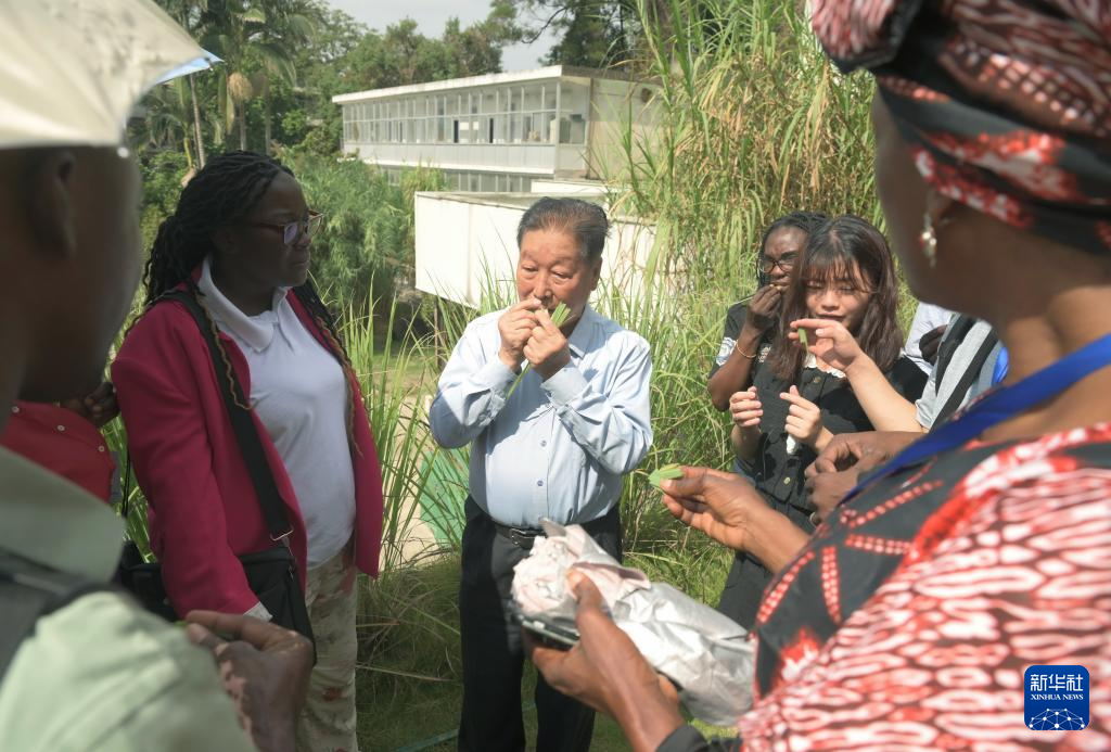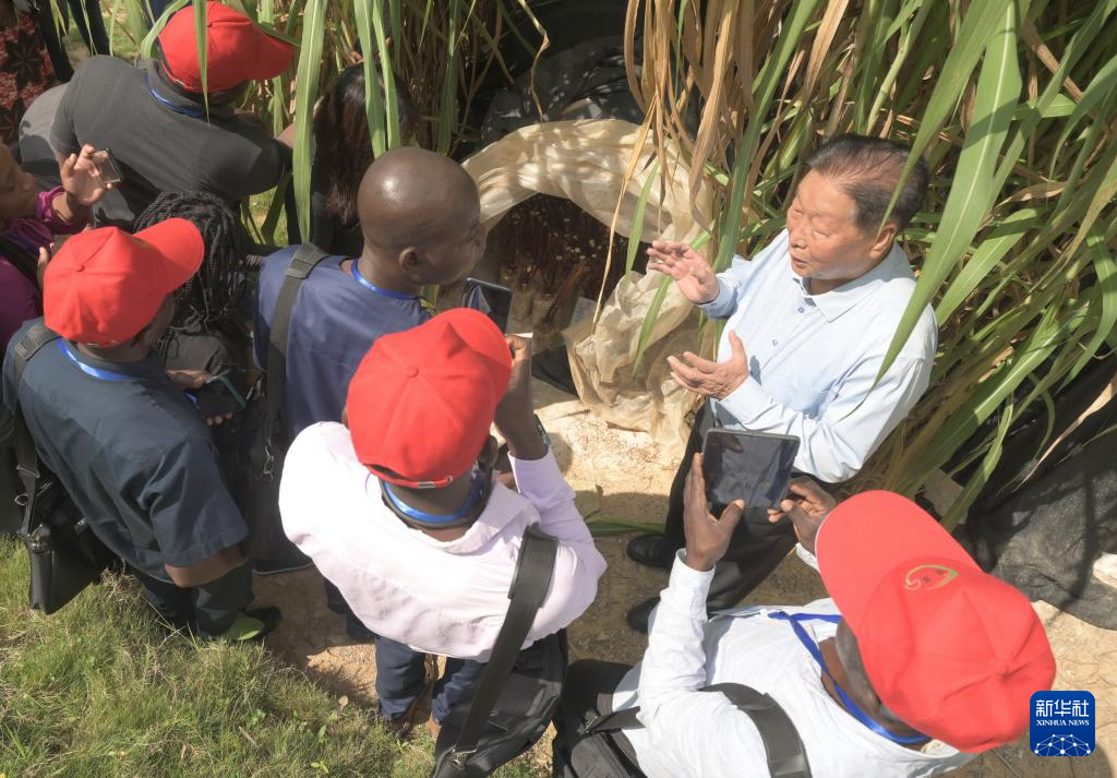 10月14日,在福建农林大学,林占熺教授(中)向参加培训的外国学员介绍巨菌草的生物学特性。新华社记者 林善传 摄