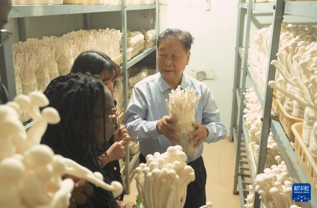 10月14日,在福建农林大学,林占熺教授(右)向参加培训的外国学员介绍菌草菇培育技术。新华社记者 林善传 摄