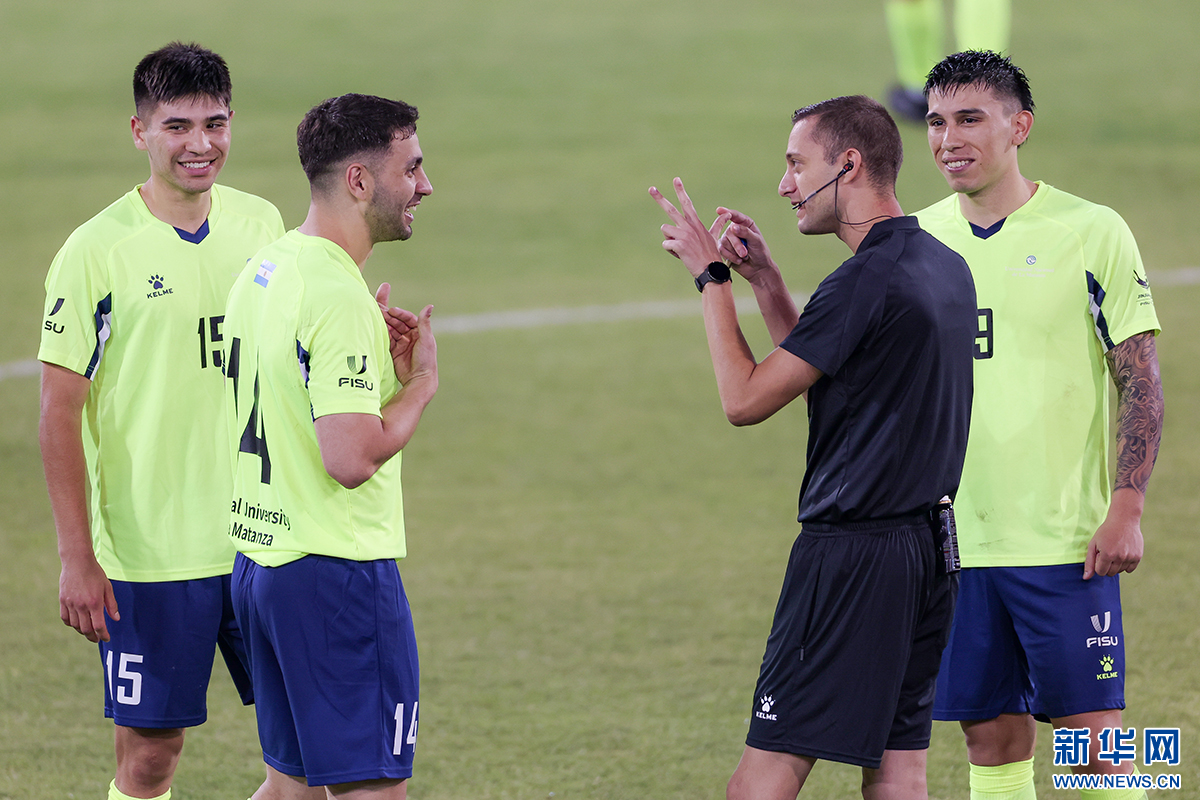 阿根廷拉马坦萨国立大学男队球员(绿色球衣)与裁判交流。新华网发(赛事组委会供图)