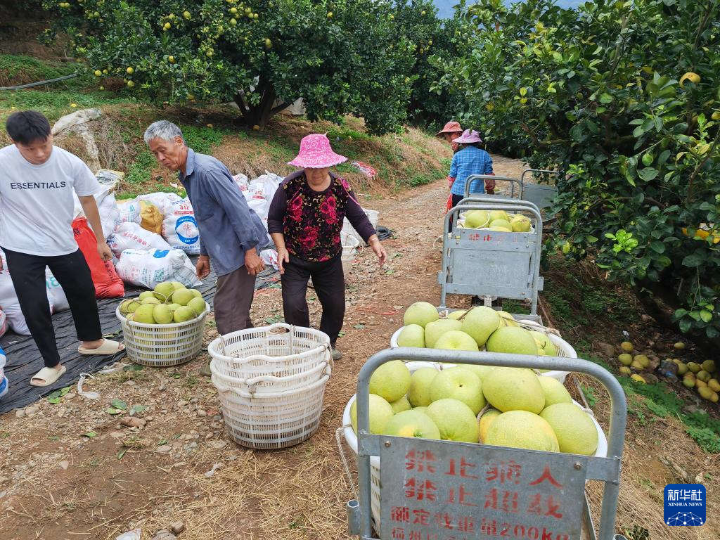 图为简易轨道“小火车”运着几筐文旦柚来到果园中的分拣处。新华社记者 陈弘毅 摄