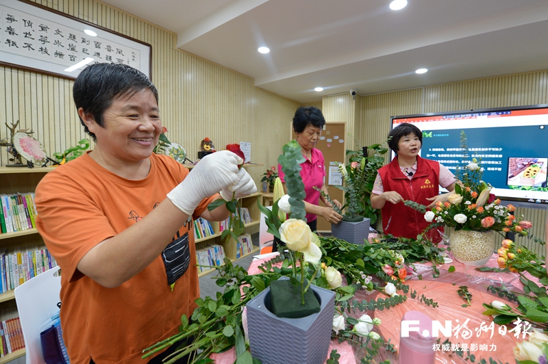 老人在屏山社区长者食堂学习插花。记者 池远 摄