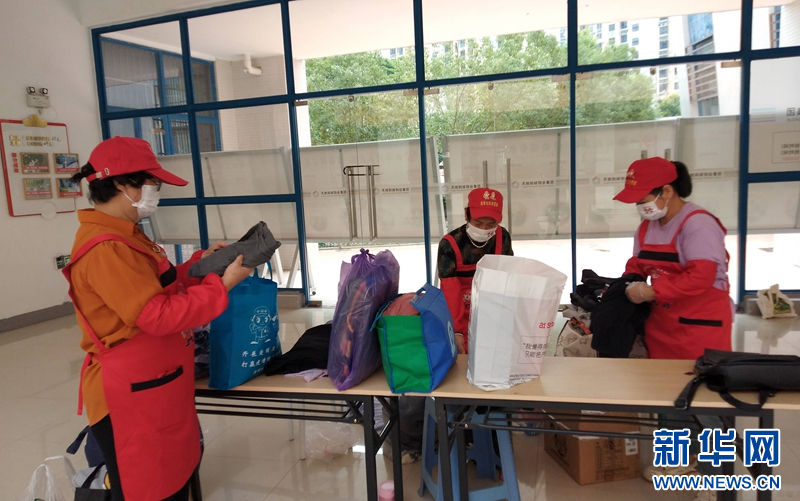 金安社区的志愿者正在打包旧衣物。新华网发(金安社区新时代文明实践站 供图)