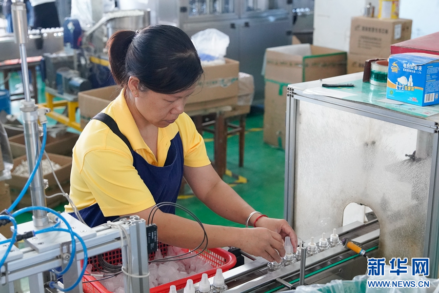 福建省金鹿日化股份有限公司是一家国家级高新技术企业。图为一位女工在半自动化的蚊香液包装生产线上工作。新华网 蒋巧玲 摄