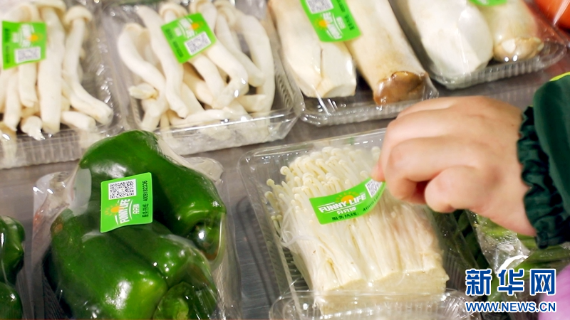 工作人员给预制净菜贴上溯源二维码。新华网发(厦门市市场监督管理局供图)