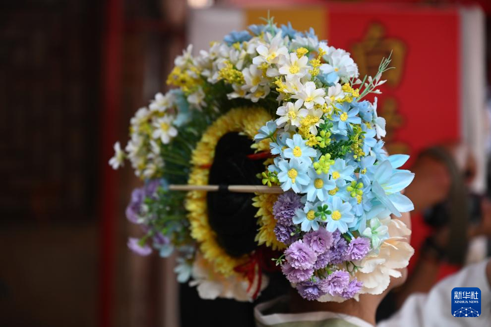 在泉州蟳埔村拍摄的簪花头饰。新华社记者 周义 摄