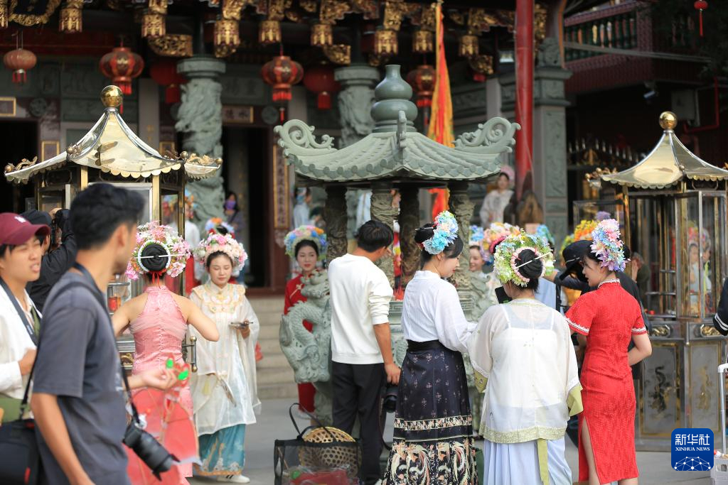 游客在泉州蟳埔村体验“簪花围”拍照。新华社记者 庞梦霞 摄