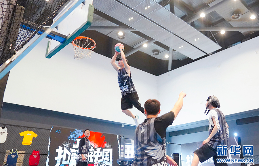 篮博会活动丰富,形式多样,图为展会现场进行的灌篮表演。新华网发(林楷煜 摄)