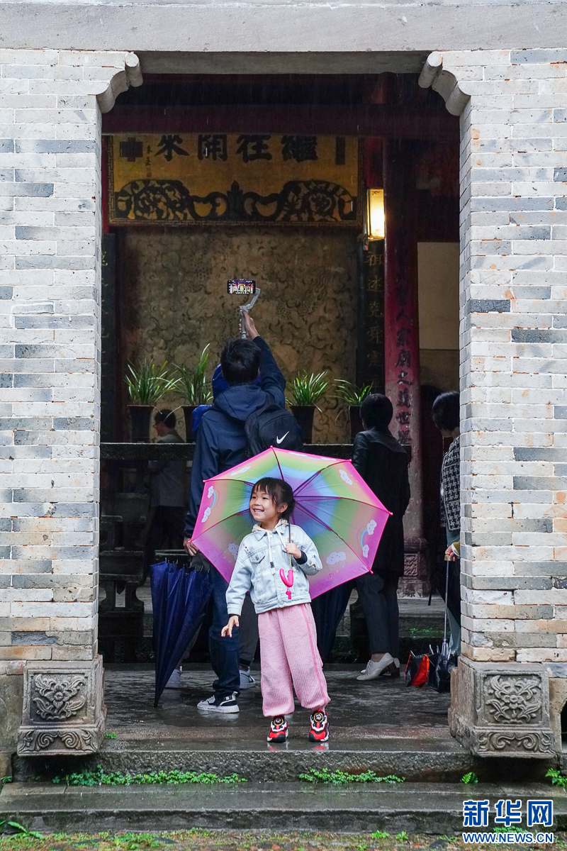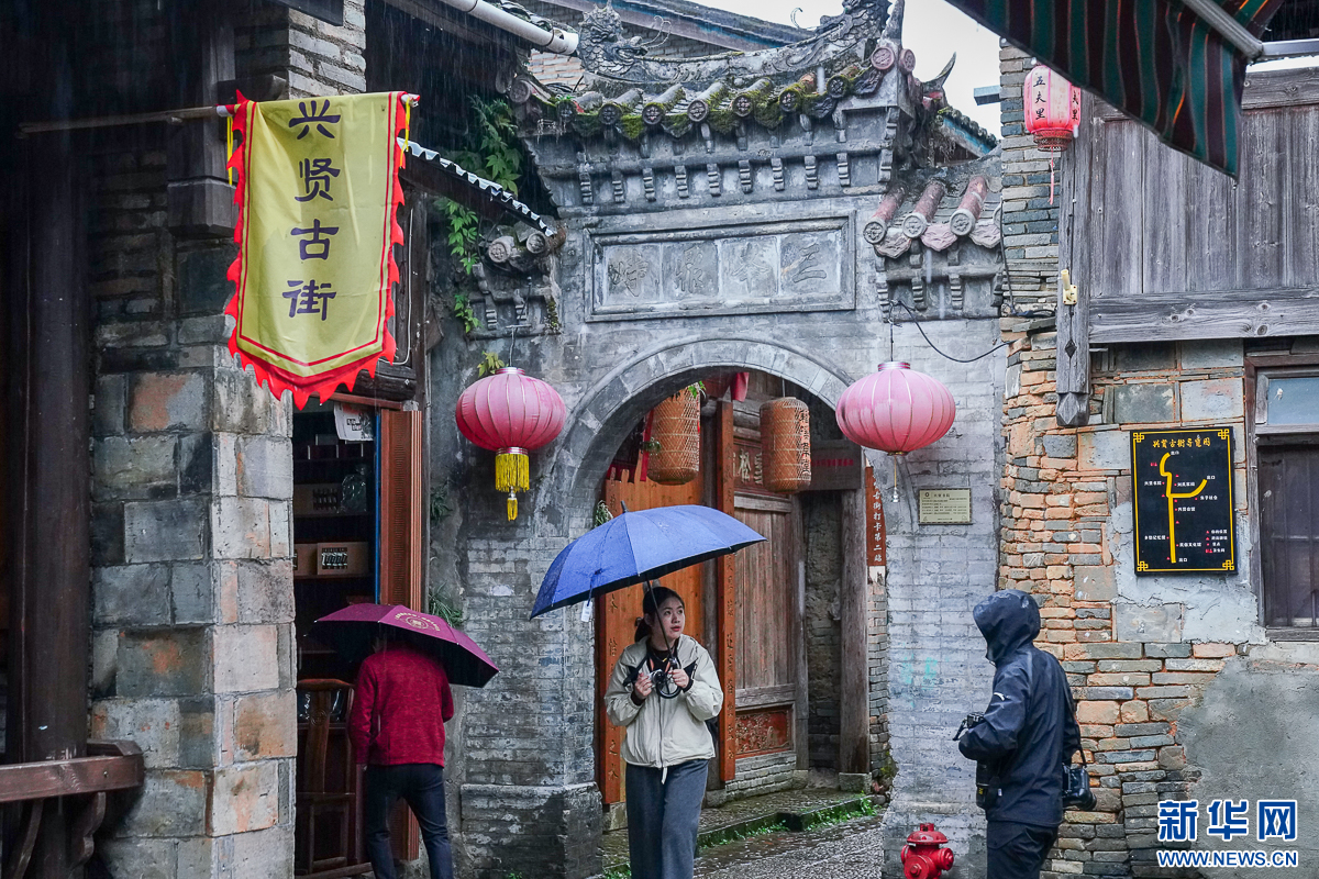 11月11日,游客撑伞在兴贤古街上漫步。新华网 肖和勇 摄