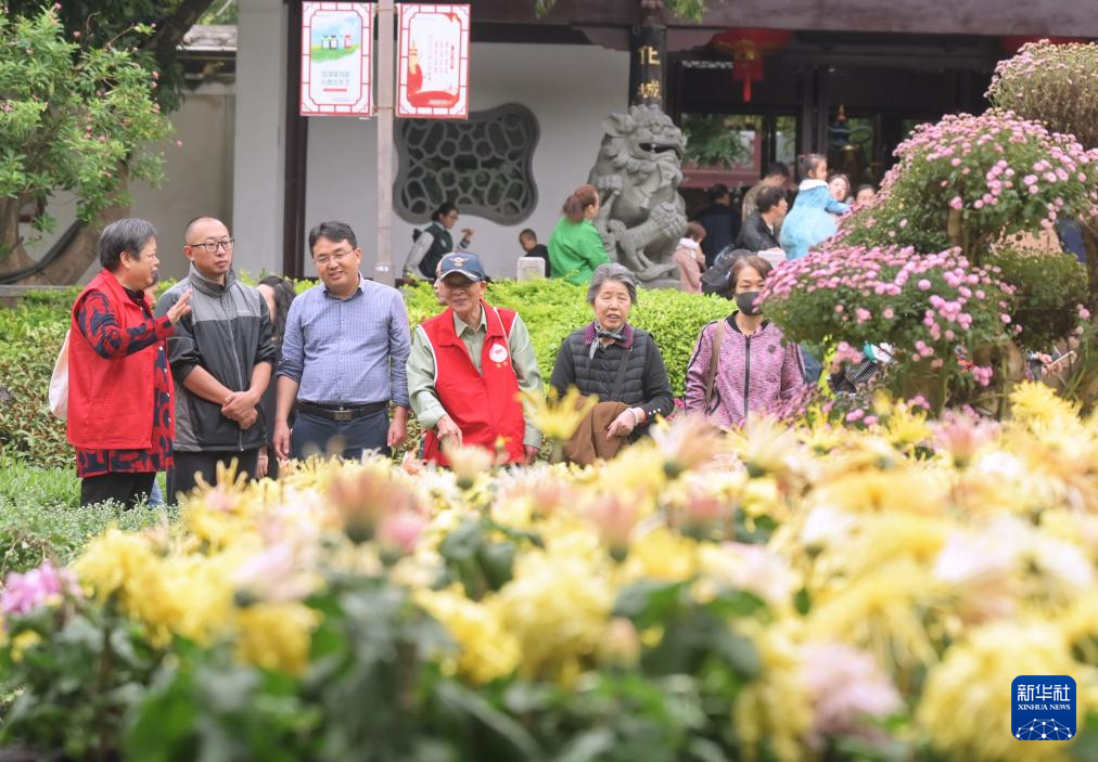 11月12日,“市民园长”陈素芬(左一)在福州西湖公园与市园林中心、西湖公园管理处管理人员交流游客参观西湖菊花展览评价等情况。新华社记者 林善传 摄