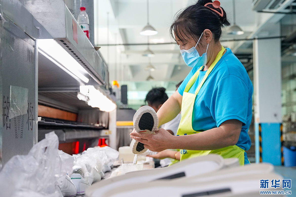 中乔体育股份有限公司的制鞋车间里,工人正在缝纫布料。 新华网 蒋巧玲 摄