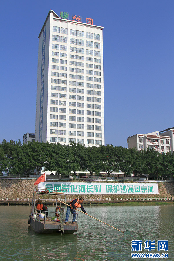 巡河人员在清理河面的漂浮物。新华网发(杨建平 摄)
