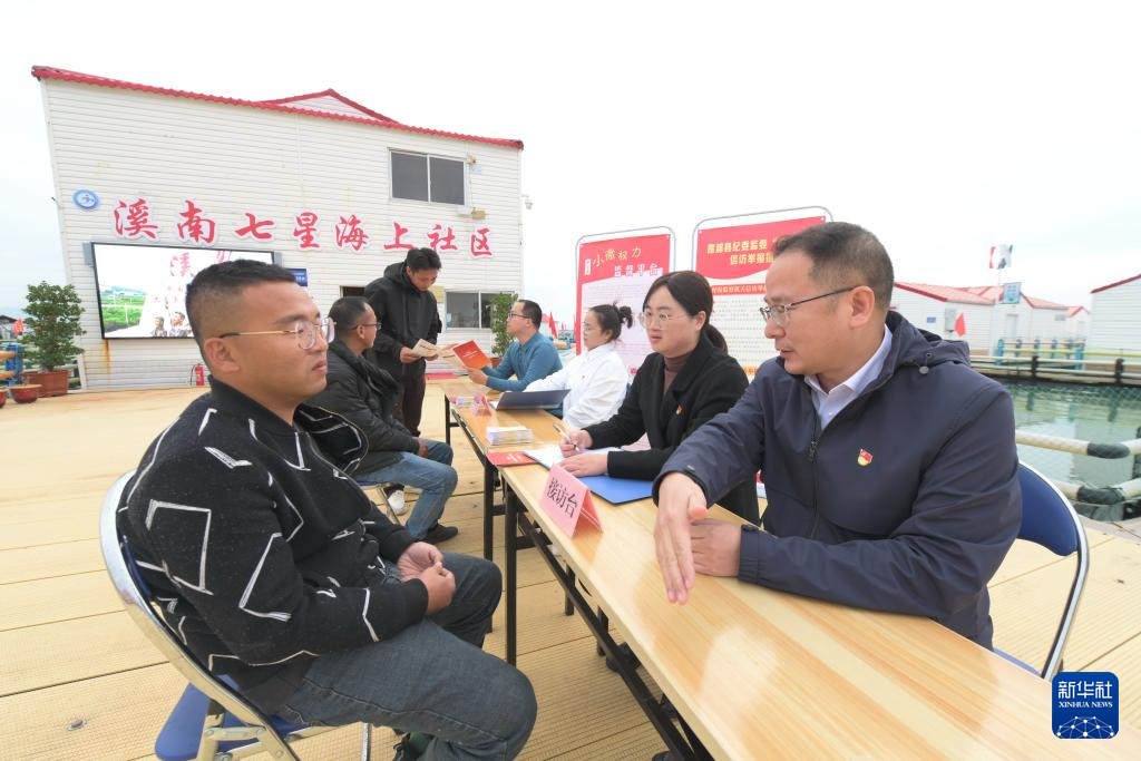 11月18日,福建省宁德市霞浦县纪委监委在七星海上社区渔排上“摆摊设点”开展信访工作。新华社记者 林善传 摄