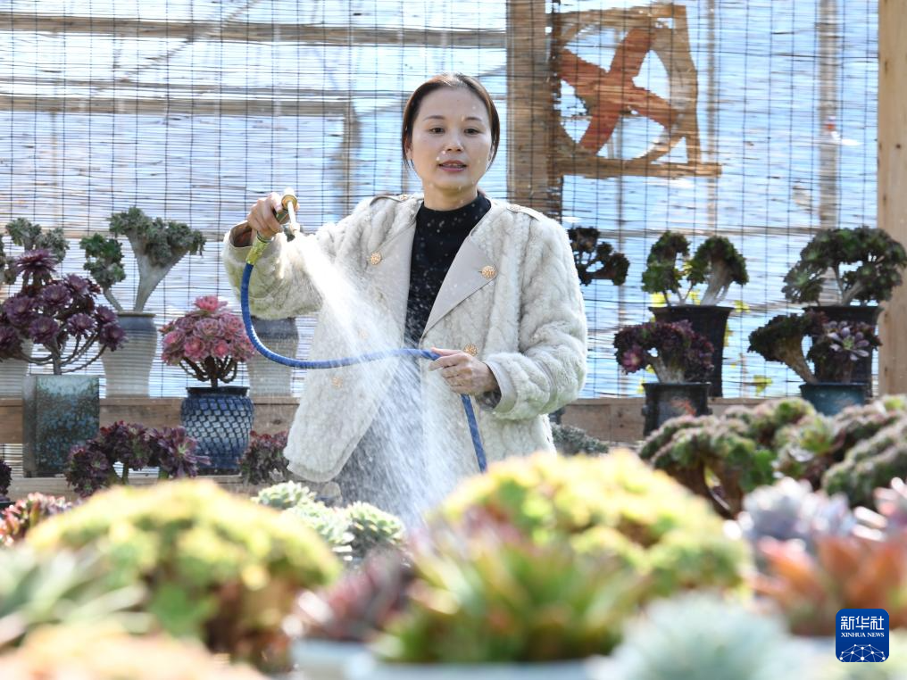 11月17日,周宁静宇园艺有限公司负责人刘林在多肉种植园大棚内为多肉植物浇水。新华社记者 姜克红 摄
