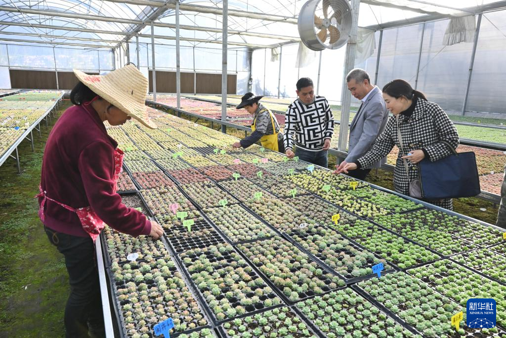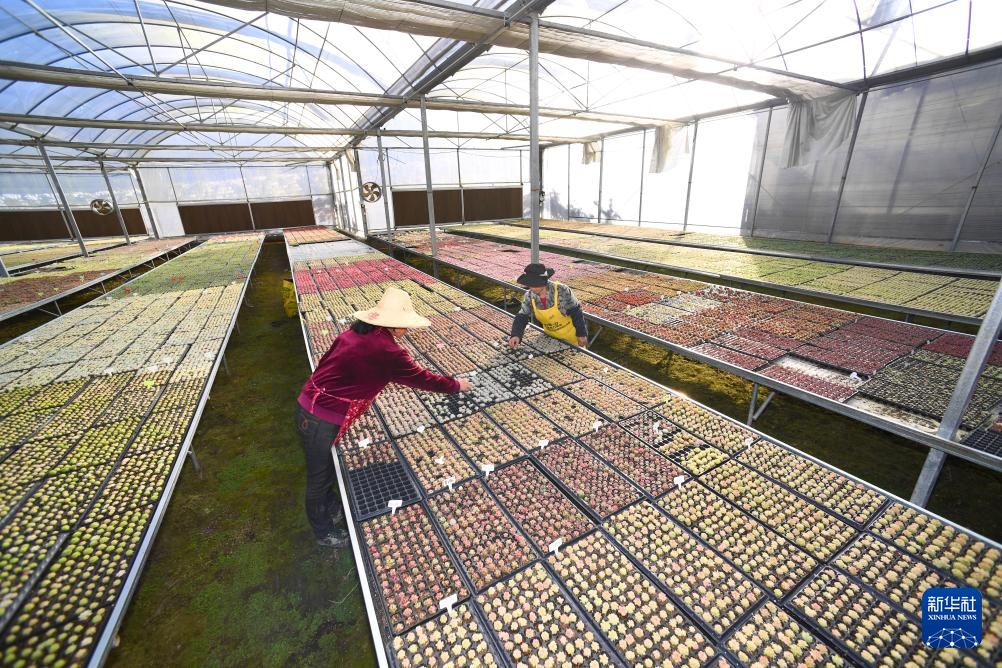 11月17日,在位于周宁县七步镇后洋村的福建三杉生物科技有限公司花卉育苗大棚内,工人在管理多肉种苗。新华社记者 姜克红 摄