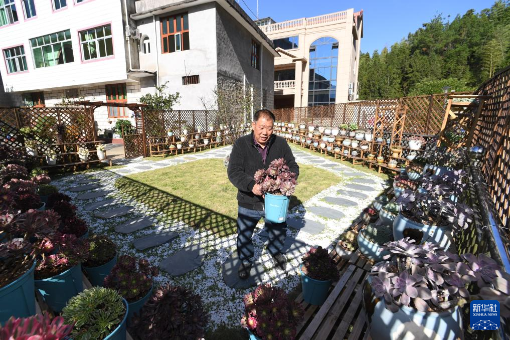 11月17日,经营花卉庭院的周宁县浦源镇溪坪村村民刘陈根在搬运多肉花盆。新华社记者 姜克红 摄