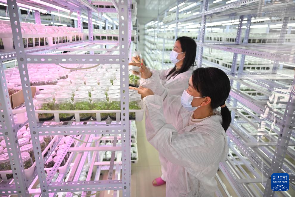 11月17日,在位于周宁县七步镇后洋村的福建三杉生物科技有限公司组培车间内,技术人员在查看多肉植物幼苗。