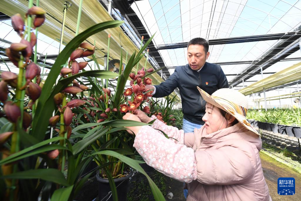 11月17日,在位于周宁县浦源镇的宁德向山兰园植物科技有限公司花卉大棚内,福建省林业科技特派员王李银(后)在指导工人种植大花蕙兰。新华社记者 姜克红 摄