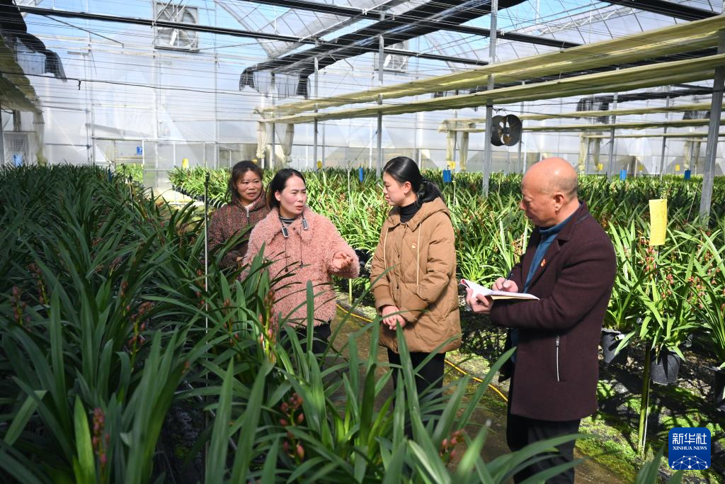 11月17日,在位于周宁县浦源镇的宁德向山兰园植物科技有限公司花卉大棚内,浦源镇党委书记李丹舟(右二)带领乡村振兴指导员(右一)向公司负责人了解企业经营情况。新华社记者 姜克红 摄