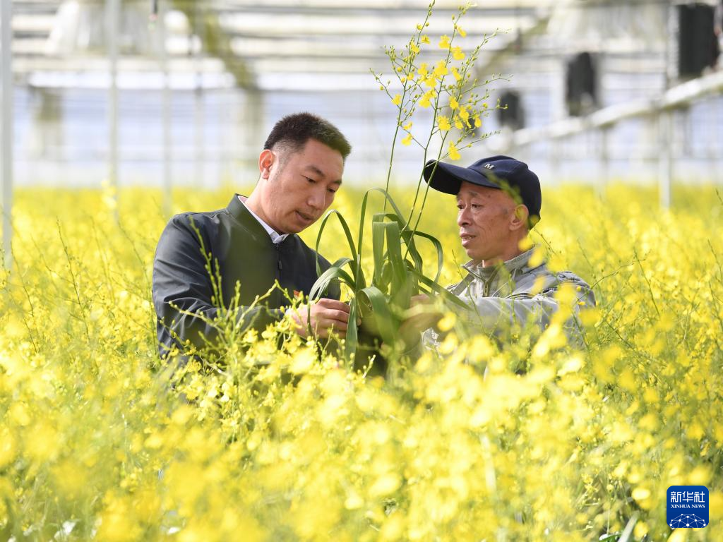11月17日,在位于周宁县浦源镇的福建馨慧兰园艺有限公司花卉大棚内,福建省林业科技特派员王李银(左)与公司负责人交流文心兰种植技术。新华社记者 姜克红 摄