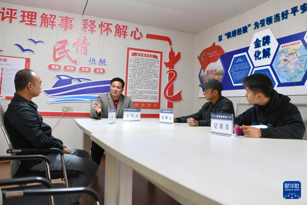 11月14日,福建省宁德市霞浦县溪南镇七星海上社区调解员谢友忠(左二)在调解一起海上养殖雇主与员工的工资纠纷。新华社记者 姜克红 摄