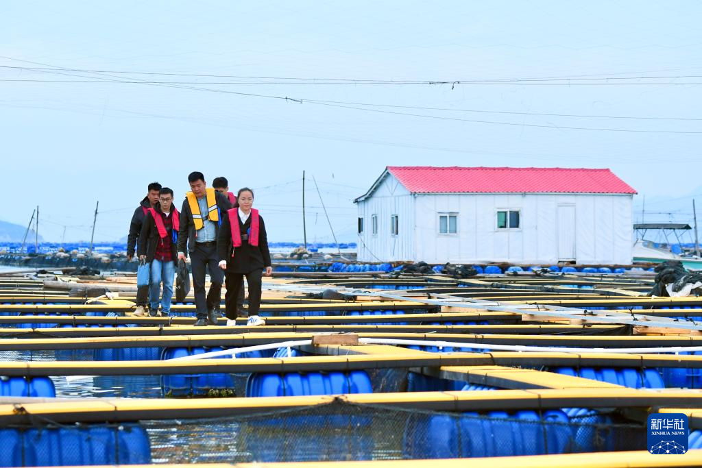 11月14日,福建省宁德市霞浦县溪南镇七星海上社区党支部书记吴德枝(左三)带领工作人员在辖区渔排走访,了解海上养殖户需求。新华社记者 姜克红 摄