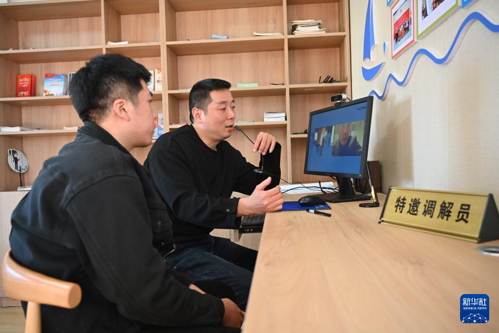 11月18日,在福建省宁德市霞浦县溪南镇七星海上社区诉非联动中心,霞浦县法院特邀调解员(右)为渔民饲料款拖欠纠纷进行视频连线调解。