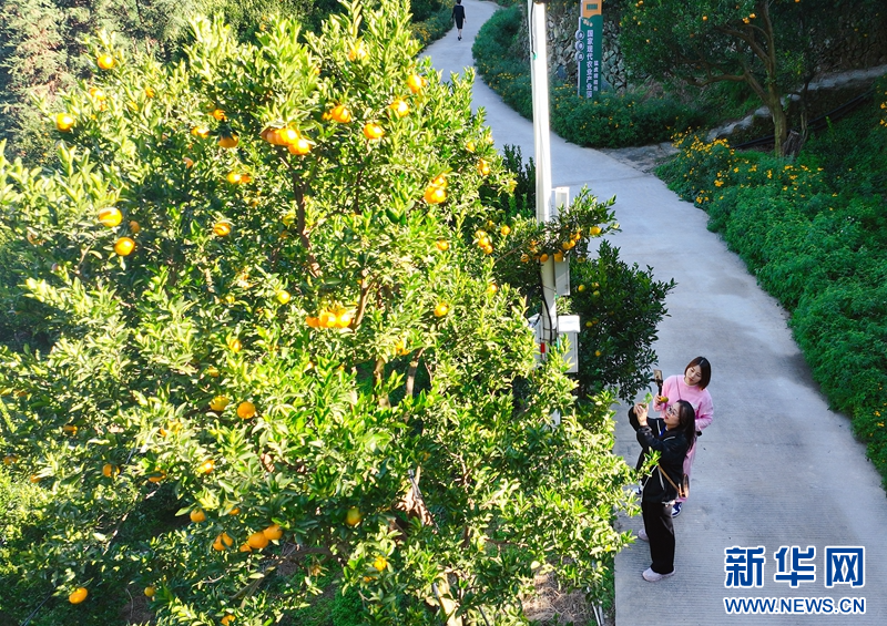 成熟的永春芦柑吸引不少市民前来体验采摘乐趣(无人机拍摄)。新华网发(林楷煜 摄)