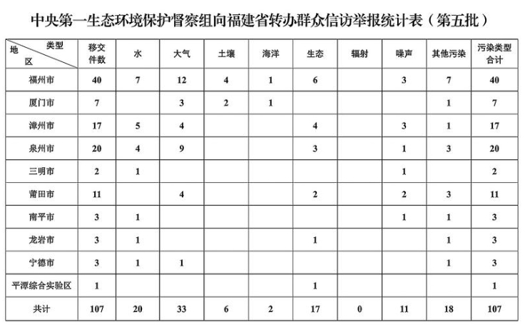 27日,中央第一生态环境保护督察组向福建省移交第五批群众信访举报件107件,其中来电举报68件,来信举报39件。