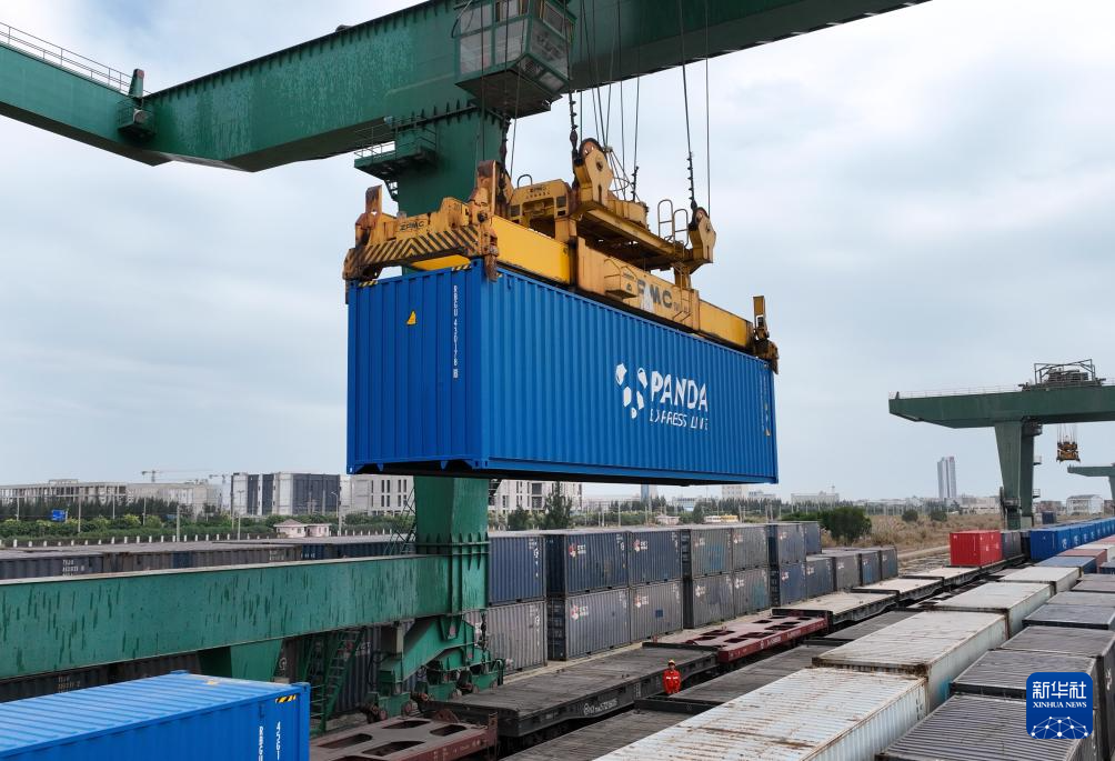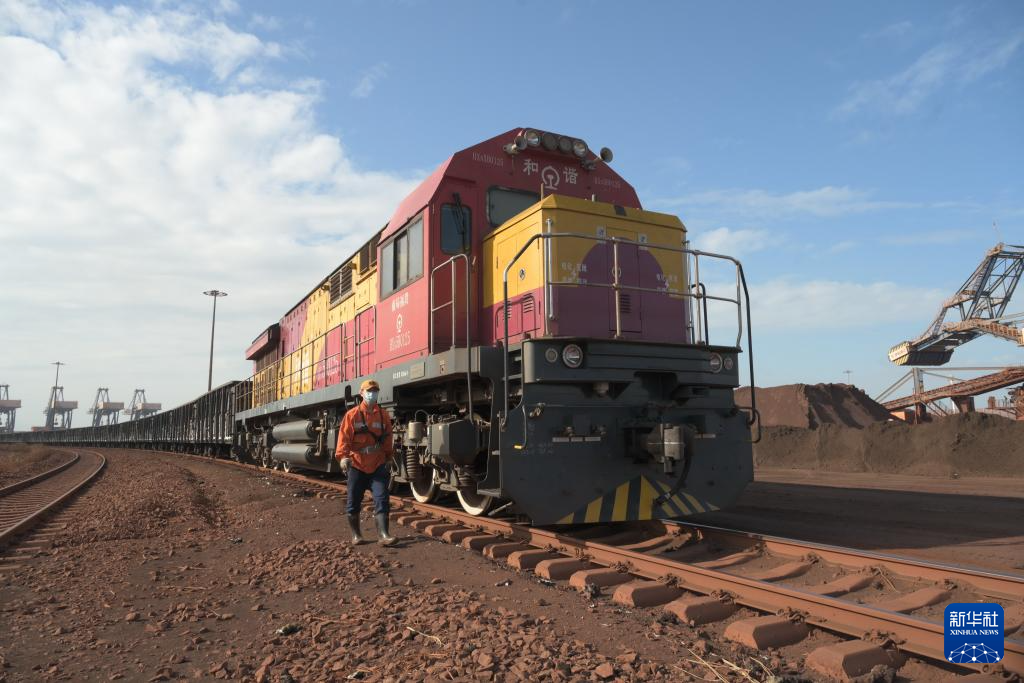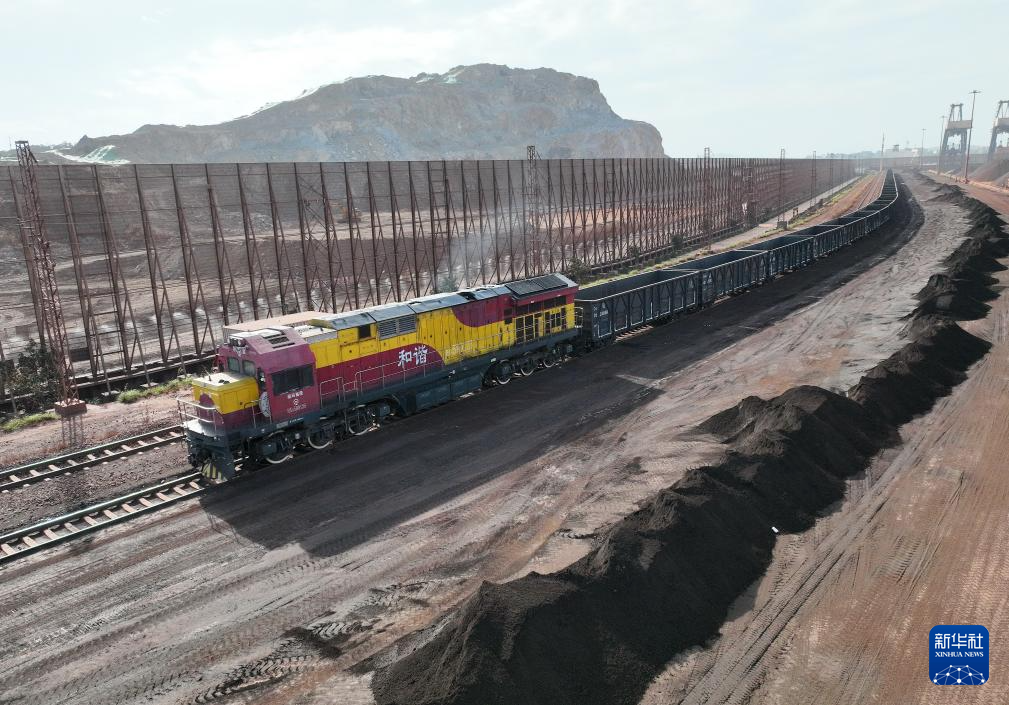11月29日拍摄的在福建莆田湄洲湾港罗屿作业区装运铁矿石的海铁联运班列。新华社记者 林善传 摄