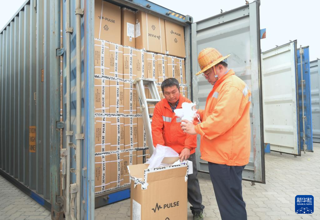 11月29日,工作人员袁泉(右)在中国铁路南昌局集团有限公司福州车务段江阴港站进行中欧班列装运前的货柜物品检查。新华社记者 林善传 摄