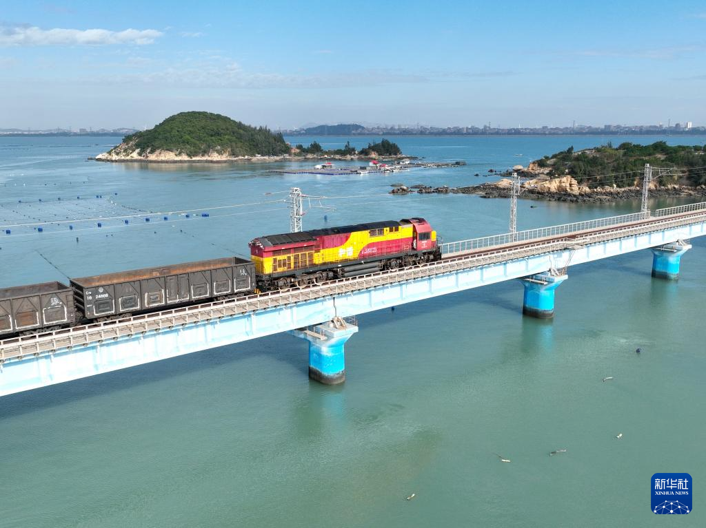 11月29日,装运铁矿石的海铁联运班列经过福建莆田湄洲湾港罗屿作业区附近的一座桥梁(无人机照片)。新华社记者 林善传 摄