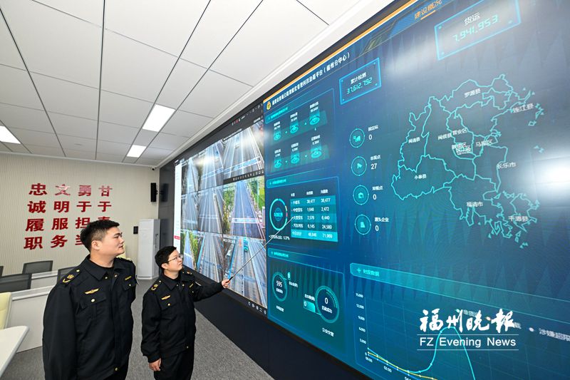 在位于交通路的福州市交通执法监测监控中心内,执法人员通过大屏幕可实时掌握全市各个路面动态监控点的货运车辆通行和称重数据,实时掌握全市货运车辆超限超载情况。