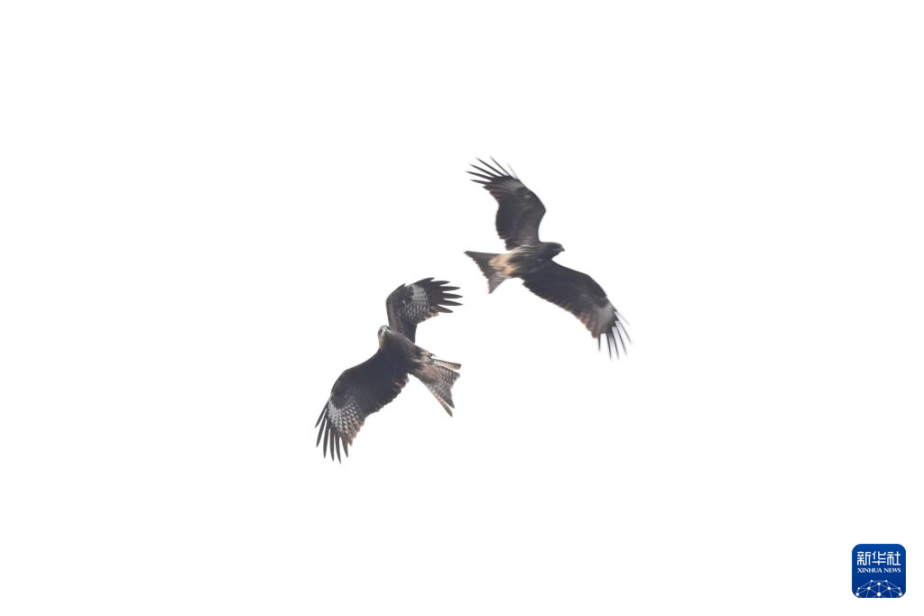 12月2日,两只黑鸢在福建省三明市泰宁县大金湖上空飞翔。新华社记者 姜克红 摄