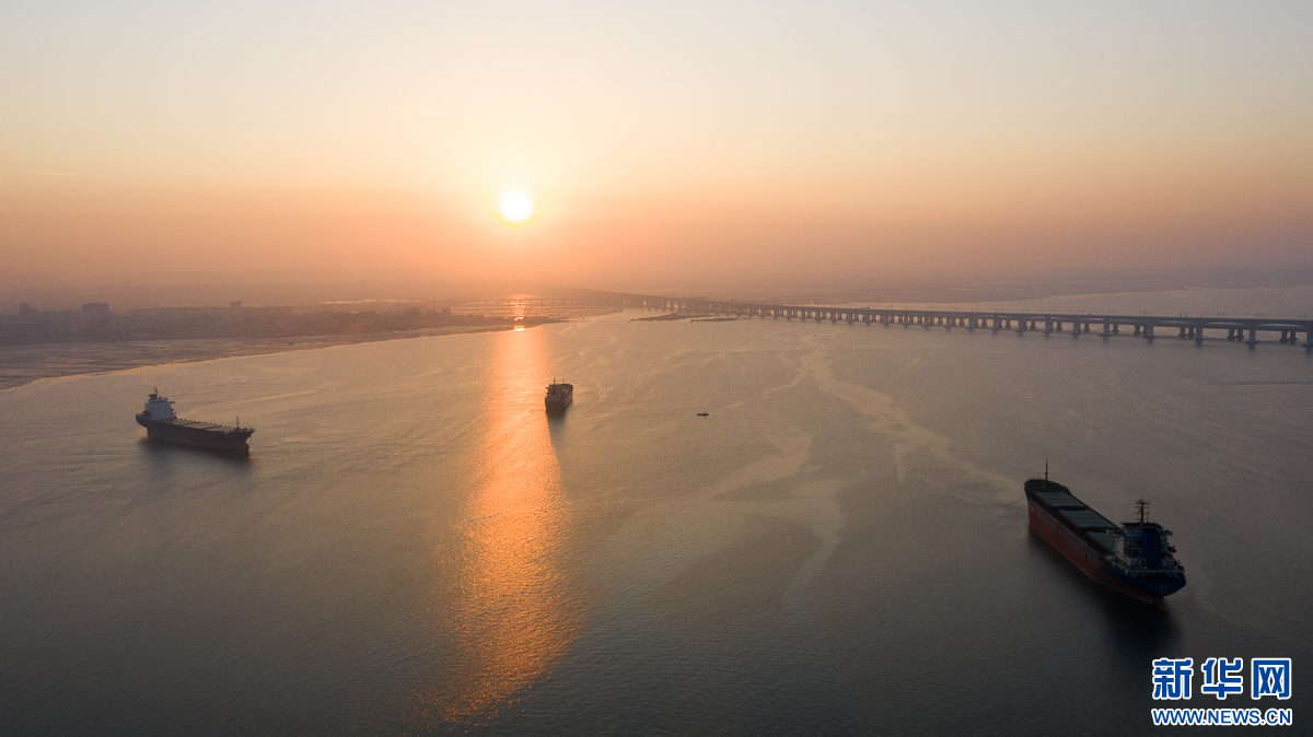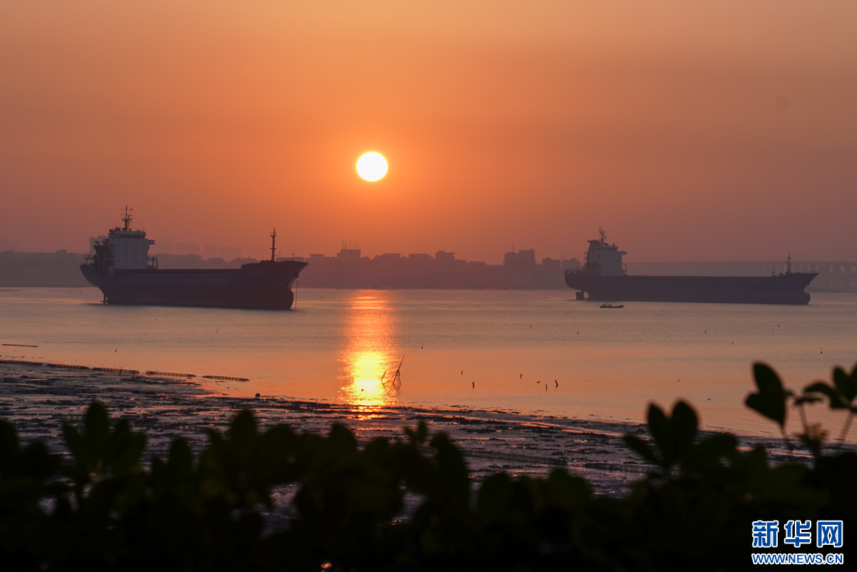 落日熔金。12月9日傍晚,泉州石狮石湖码头,夕阳映照在海面上,泉州湾跨海大桥在落日余晖中显得格外壮美。