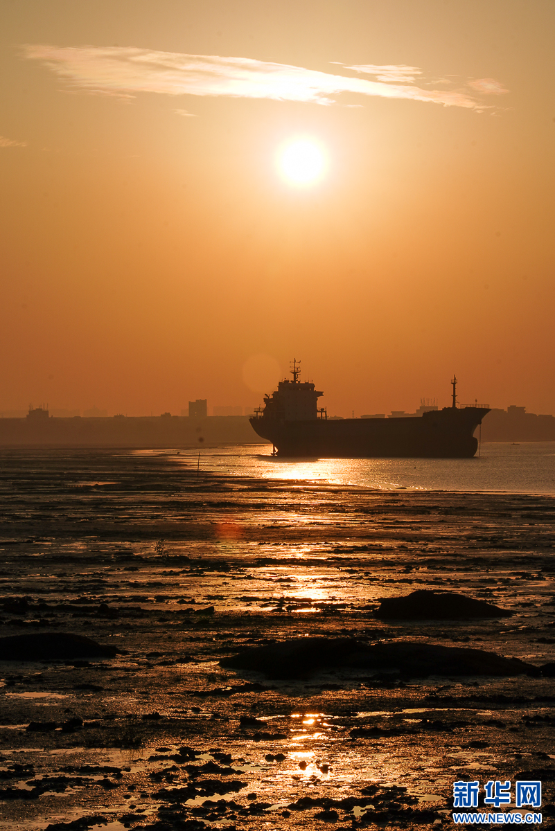 这是12月9日在泉州石狮石湖码头拍摄到的落日、船只与滩涂。新华网 肖和勇 摄