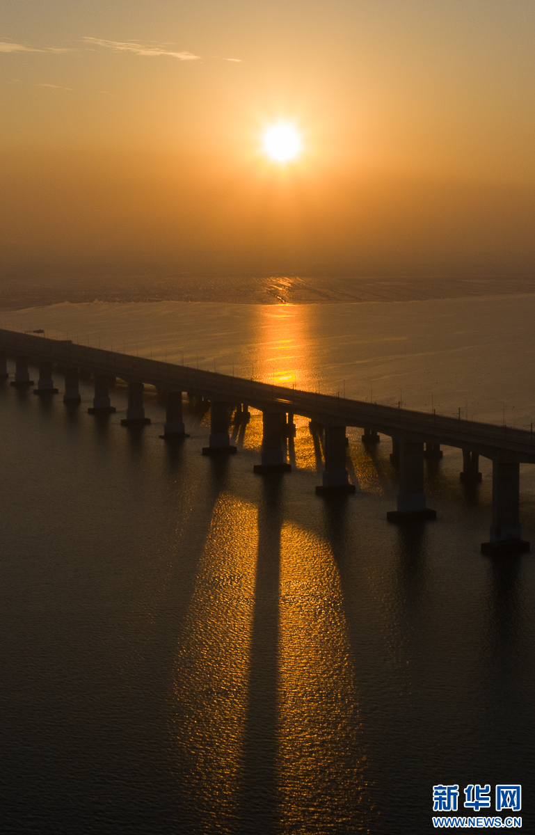 12月9日,夕阳西下,泉州湾跨海大桥桥墩倒映在海面上(无人机照片)。新华网 肖和勇 摄