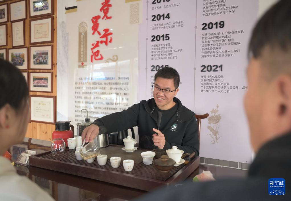 12月8日,带动村民发展致富的赤溪村党员、返乡创业大学生杜赢为来自北京的客人介绍赤溪白茶。