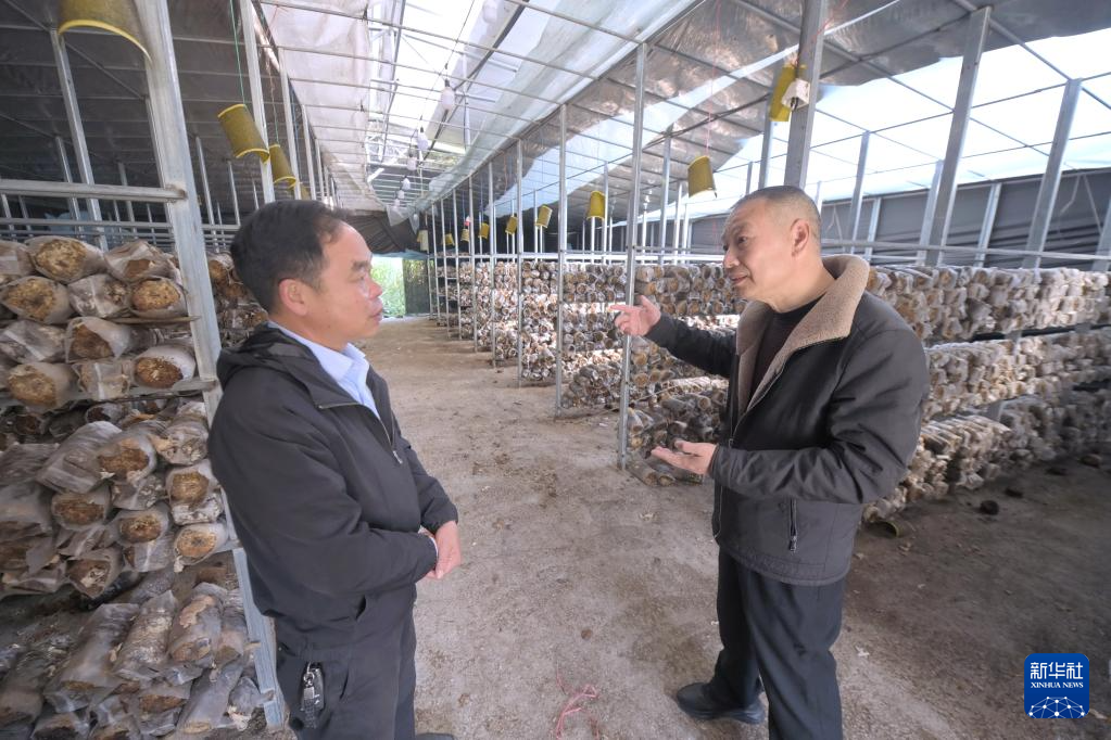 12月8日,乡村振兴特聘指导员周秦福(右)与赤溪村党总支书记吴贻国商讨对村里的菌菇房设备进行升级改造事宜。新华社记者 林善传 摄