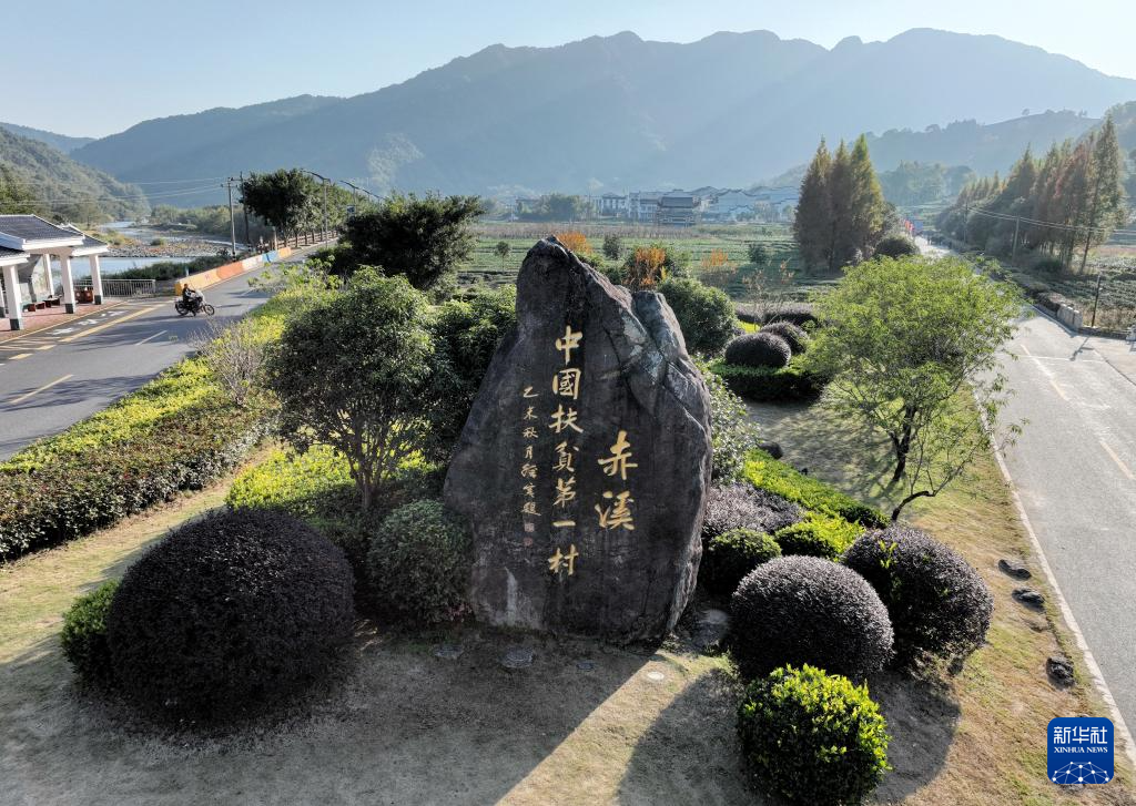 12月7日在赤溪村拍摄的“中国扶贫第一村”石碑(无人机照片)。新华社记者 林善传 摄