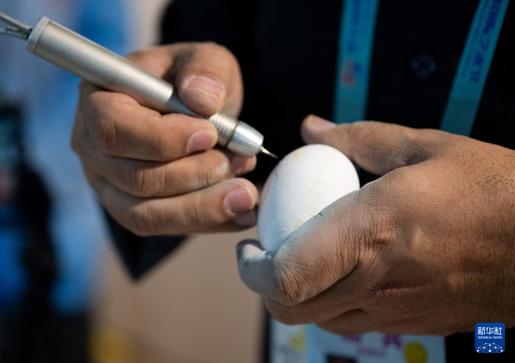 这是来自科威特的蛋雕艺术家阿里·萨巴赫南姆在使用工具雕刻鸡蛋(12月9日摄)。新华社记者 魏培全 摄
