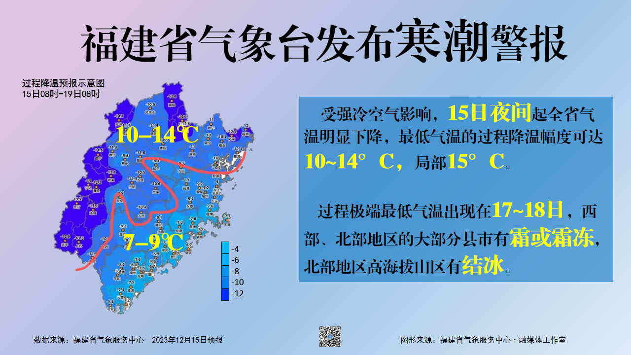 气温方面,15日夜间开始,全省气温明显下降,西部、北部地区大部和其余地区的局部最低气温过程降温幅度可达10~14℃,局部15℃,将出现寒潮。最低气温出现在17日至18日,南平大部、宁德大部和三明、龙岩两市的中西部城区可达0~4℃,有霜或霜冻,高海拔山区可达-1~0℃,有结冰;中南部沿海地区城区最低气温7~11℃;其余地区城区4~7℃。