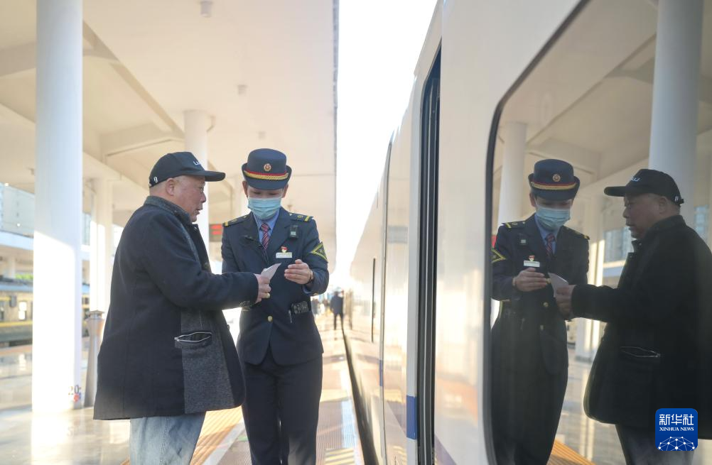 12月26日,从龙岩站出发的D9958次动车组列车工作人员在引导乘客上车。新华社记者 林善传 摄