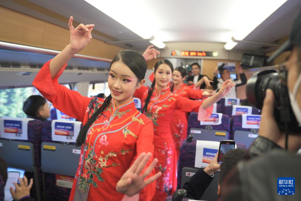 12月26日,演员在武平开往龙岩的D9956次动车组列车上表演舞蹈。新华社记者 林善传 摄