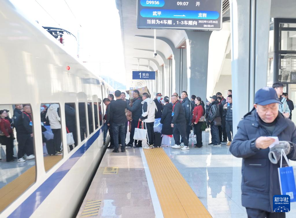12月26日,乘坐D9956次动车组列车从武平到龙岩的乘客在排队上车。新华社记者 林善传 摄
