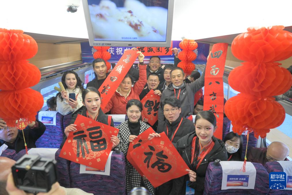 12月26日,在从武平开往龙岩的D9956次动车组列车上,工作人员和乘客庆祝龙龙高铁龙岩至武平段正式开通运营。