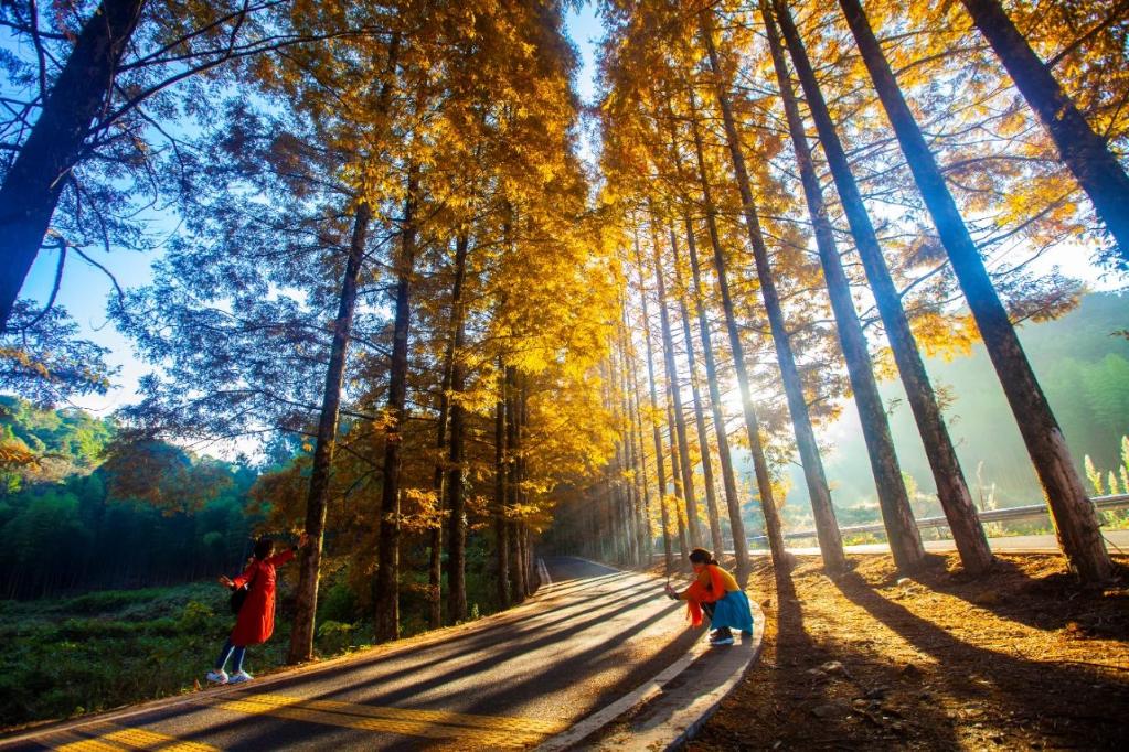 清晨阳光映射龙栖山水杉大道,游客早早到此留影